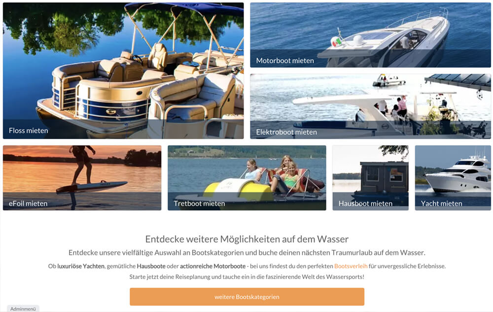 Navigiere über die Startseite und finde eine Übersicht über verschiedene verfügbare Bootskategorien, darunter Flöße, Motorboote, Kanus, Tretboote und weitere Bootstypen. Je nach deinen Bedürfnissen und Vorlieben kannst du die Kategorie auswählen, die am besten zu deinem geplanten Wasserausflug passt. Egal, ob du nach entspanntem Dahingleiten auf einem Floß, rasanter Geschwindigkeit mit einem Motorboot, sportlicher Erfahrung mit einem Kanu oder gemütlichem Tretbootfahren suchst, die Vielfalt an Bootsoptionen ermöglicht es dir, ein unvergessliches Erlebnis auf dem Wasser zu genießen.