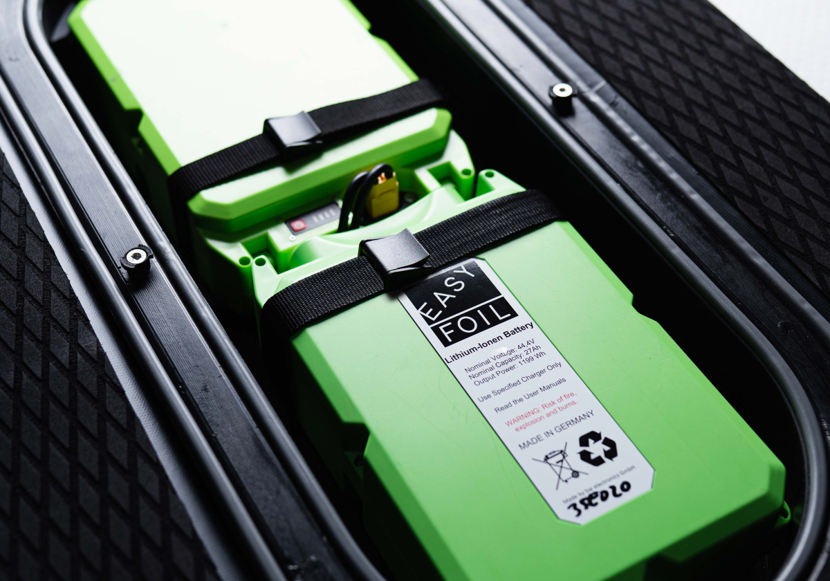 Das EASYFOIL TWO gibt dir die Möglichkeit eine oder zwei 28 Ah Batterie in einer wasserdichten und entfernbaren Box anzuschließen. 2 Batterien garantieren Spaß für bis zu 3 Stunden und können innerhalb von 2.5 Stunden wieder voll aufgeladen werden.