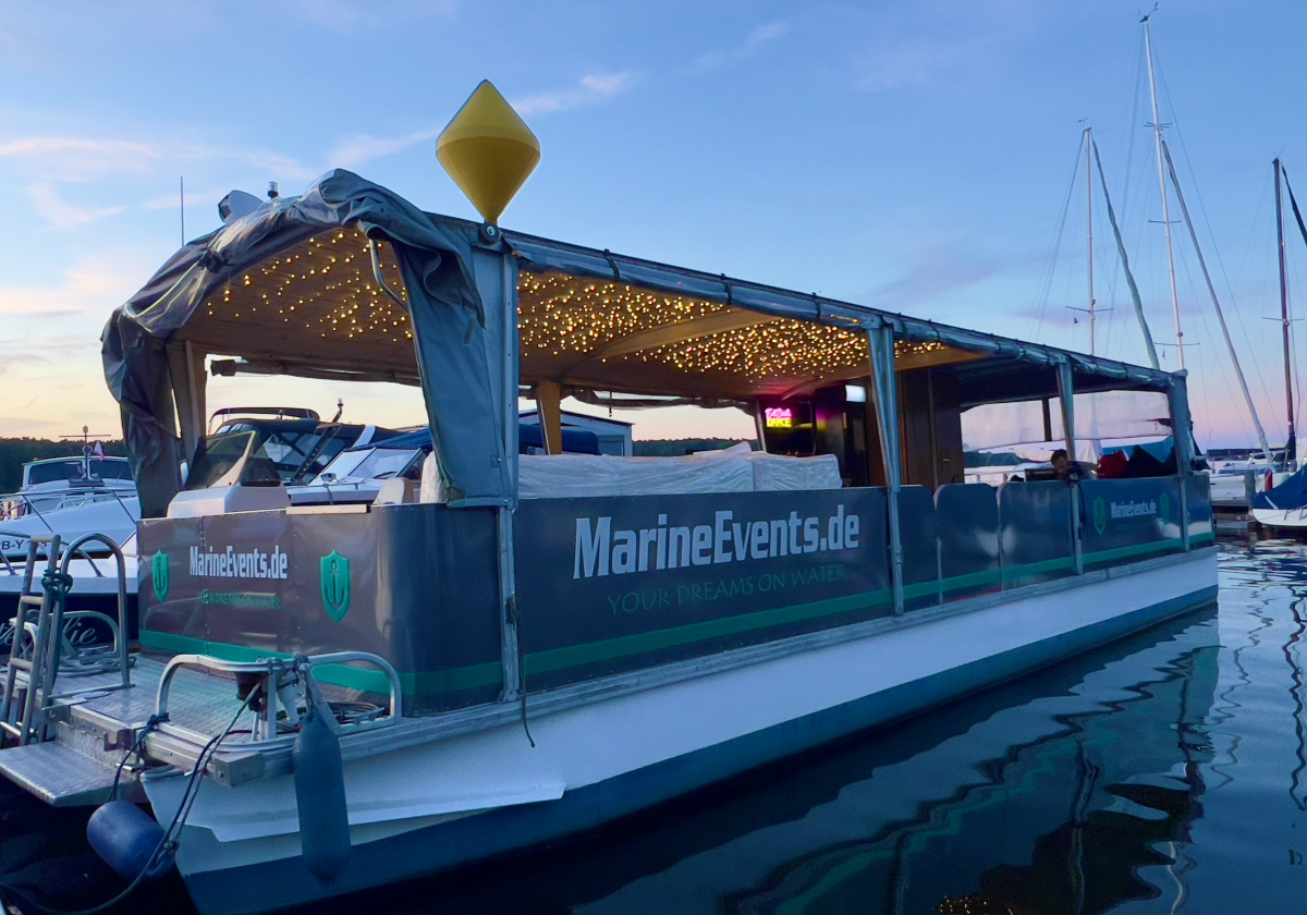 Das Ms Nautica liegt im Hafen bei Berlin, ist für bis zu 25 Personen zugelassen.
