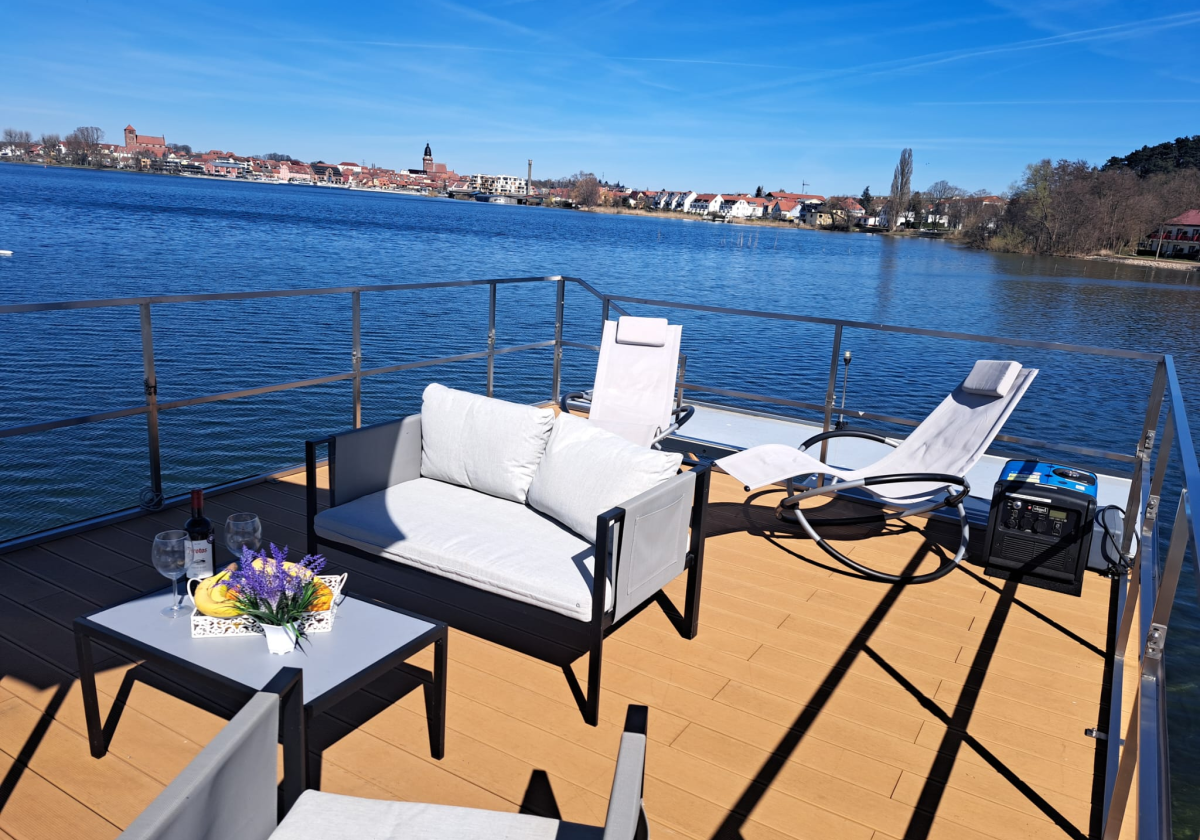 Die Heckterrasse, verfügt über eine große Badeplattform und bietet mit der vorhandenen Badeleiter einen komfortablen Zugang zum Wasser, auch von hier aus gelangen Sie über eine sichere Treppe auf die große Dachterrasse, welche zum Sonnenbaden oder gemütlichen Grillen einlädt.