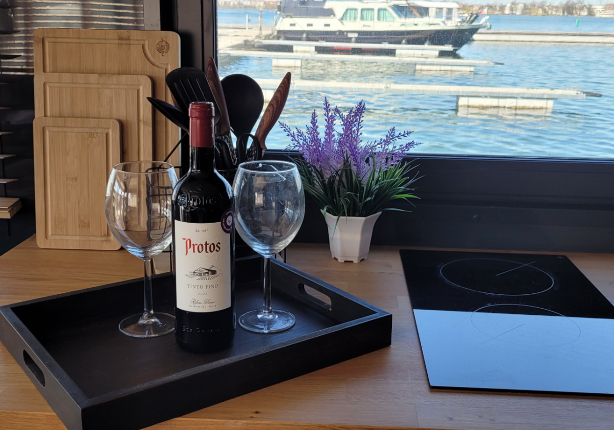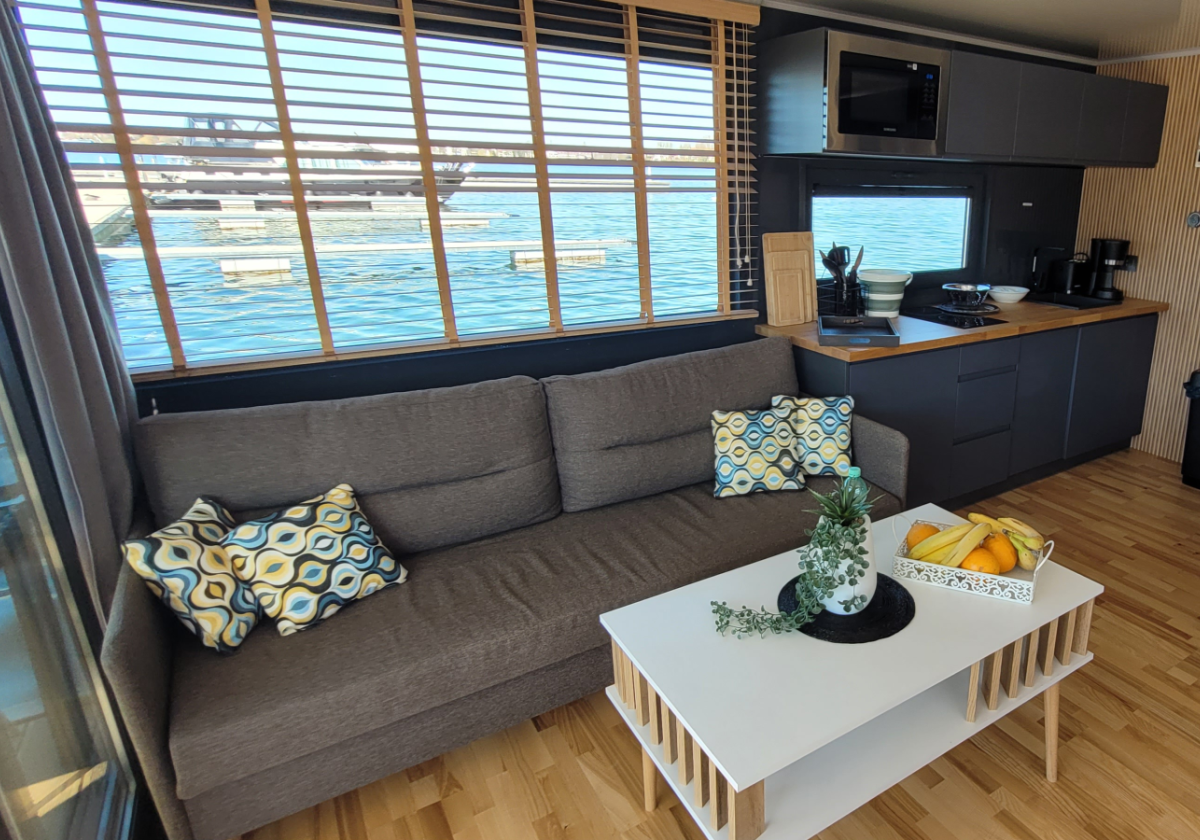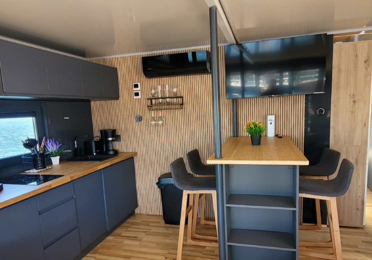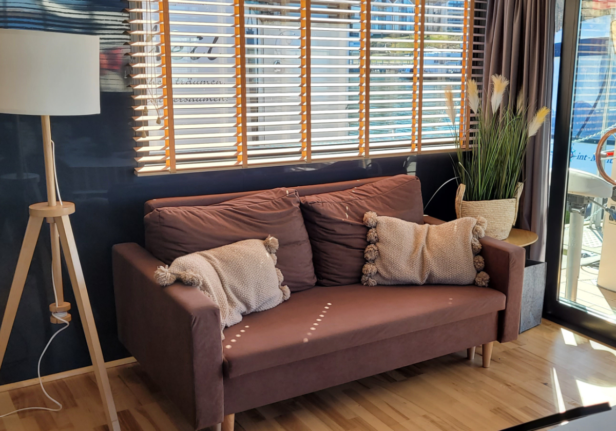 Von der Bugterrasse aus erreichen Sie, durch die großen Glasschiebetüren, unseren Salon der sofort zum verweilen einlädt. Ausgestattet mit ausreichend Möglichkeiten die Seele baumeln zu lassen, ob auf einer der gemütlichen Sofas bei einem Glas Wein mit Blick auf das Wasser und die umliegende Natur oder bei einem Spieleabend mit der ganzen Familie, Sie werden Ihren Urlaub auf diesem Hausboot genießen.