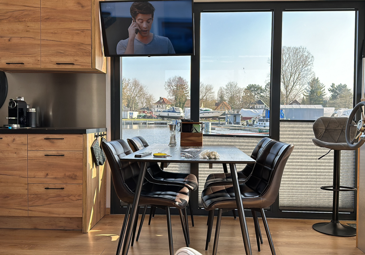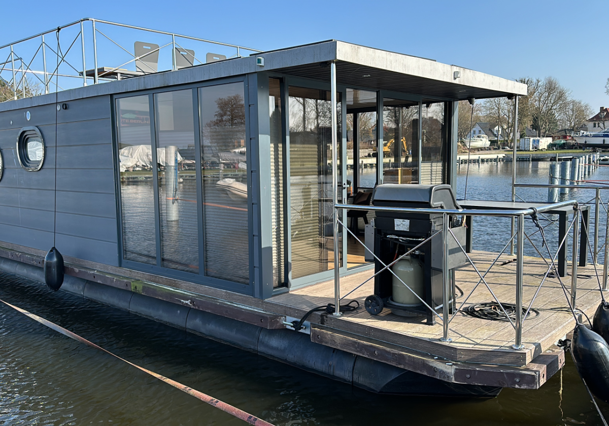 Das Hausboot liegt im Yachthafen Schmöckwitz, bereit für Ihre Abenteuer.